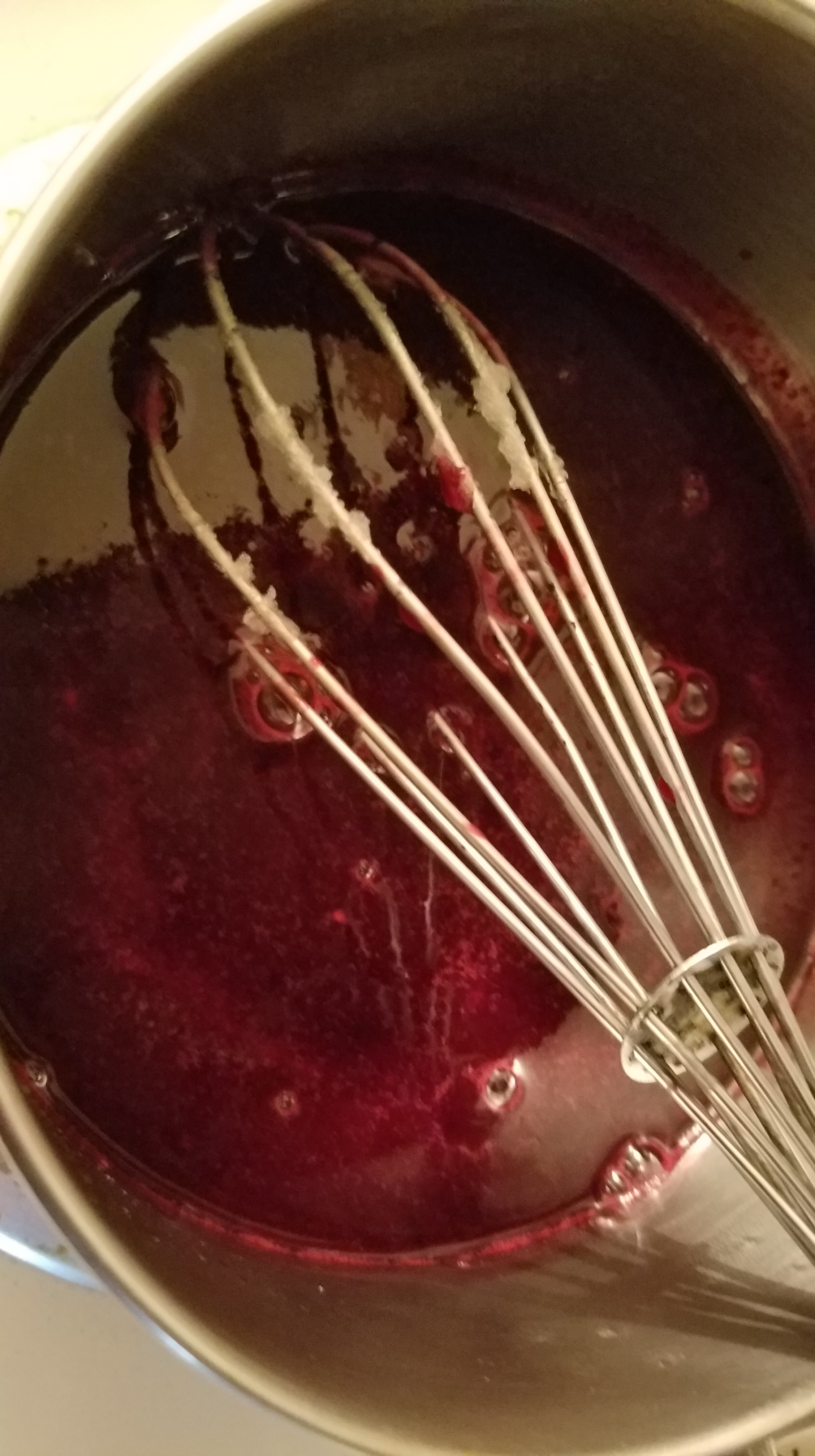Start to warm up the sweetened berries. Once it is warmed up add in the gelatin blob. Mine came out in a big plop!
