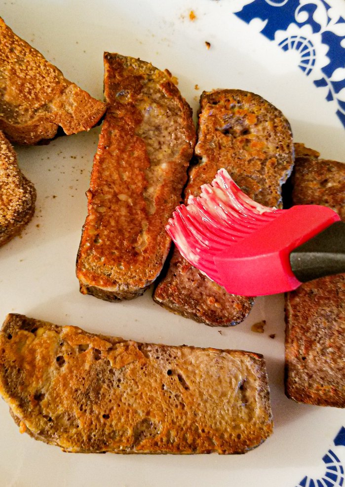 - As the french toast sticks are done, brush them with softened, or melted butter. Then dip each one in the cinnamon and sweetener mixture bowl.