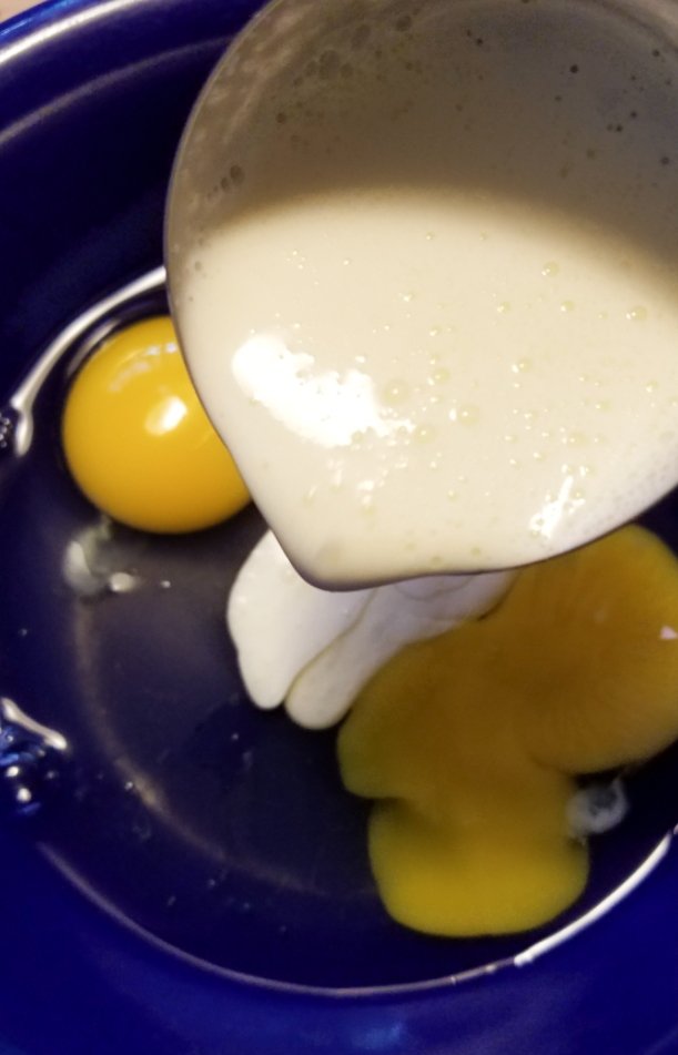 - Whisk up 2 large whole eggs and 1/4 cup heavy cream(or canned coconut milk) in a large bowl.