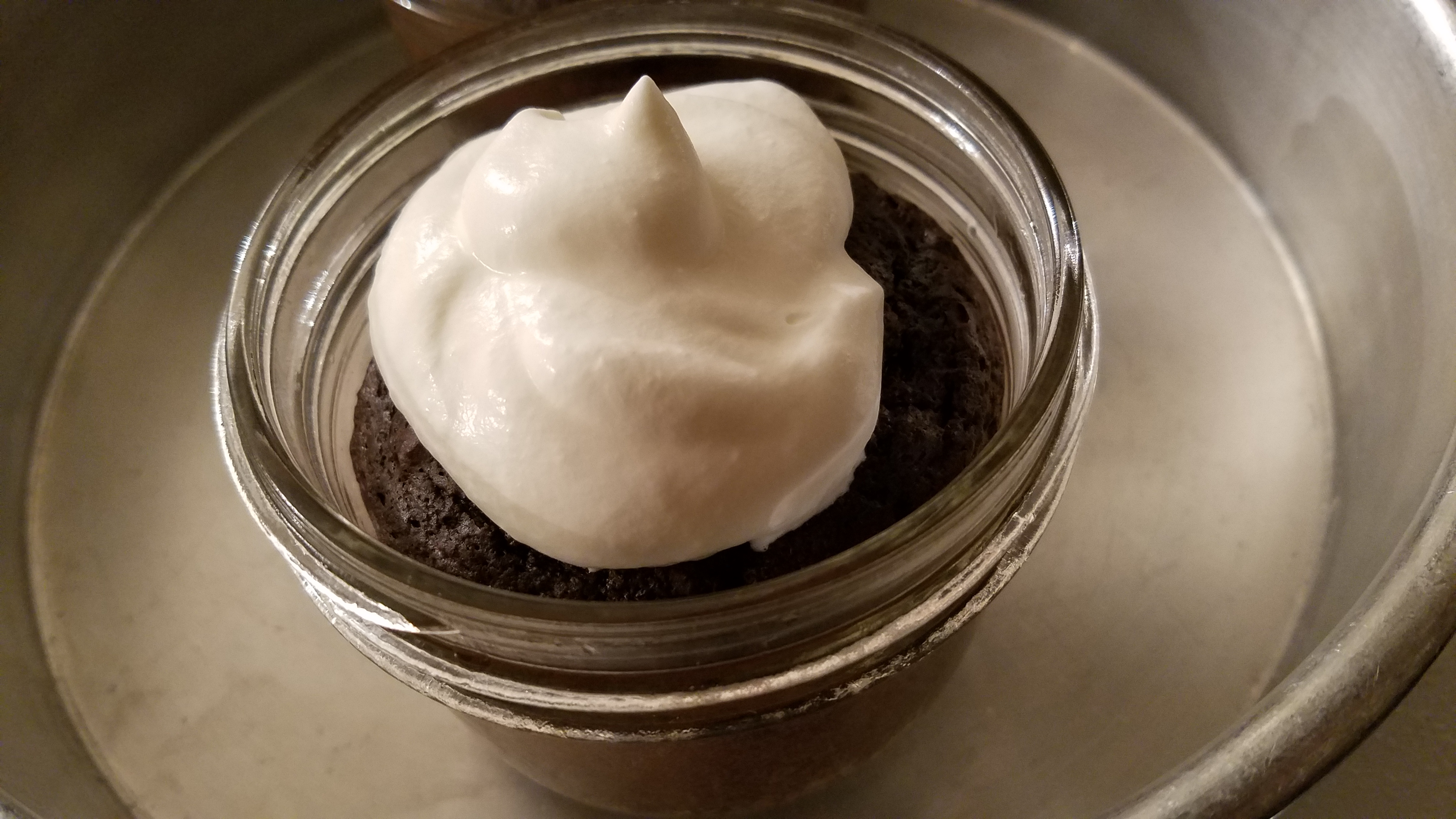 Whisk all together except coconut oil. Then add coconut oil to the batter at the end. Pour evenly into two greased 8 oz (half pint) jars or large ramekins.