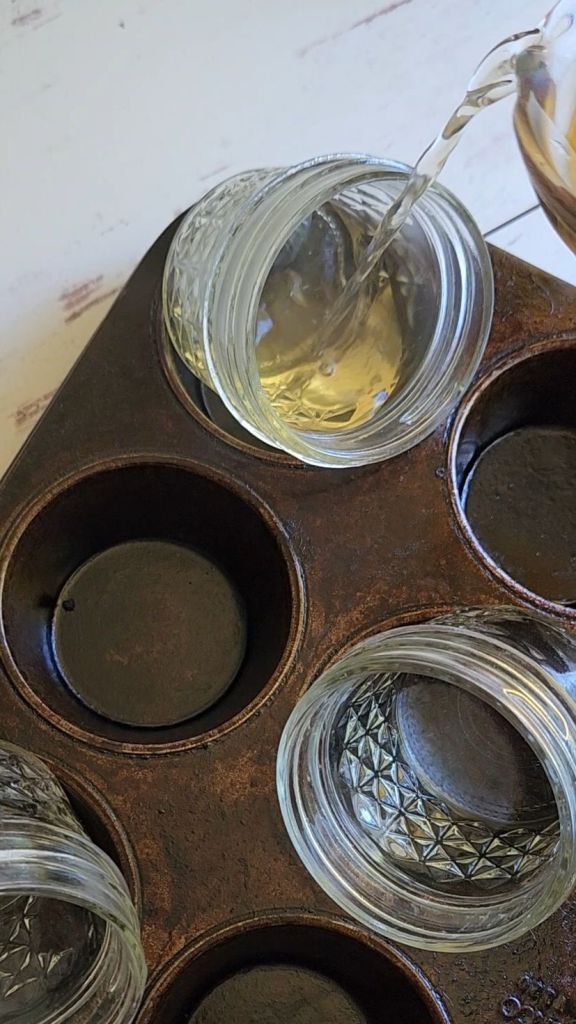 You may need to put a little ball of foil in the muffin tin to help keep the tilted position. I just positioned them so the jar thread held it in place.