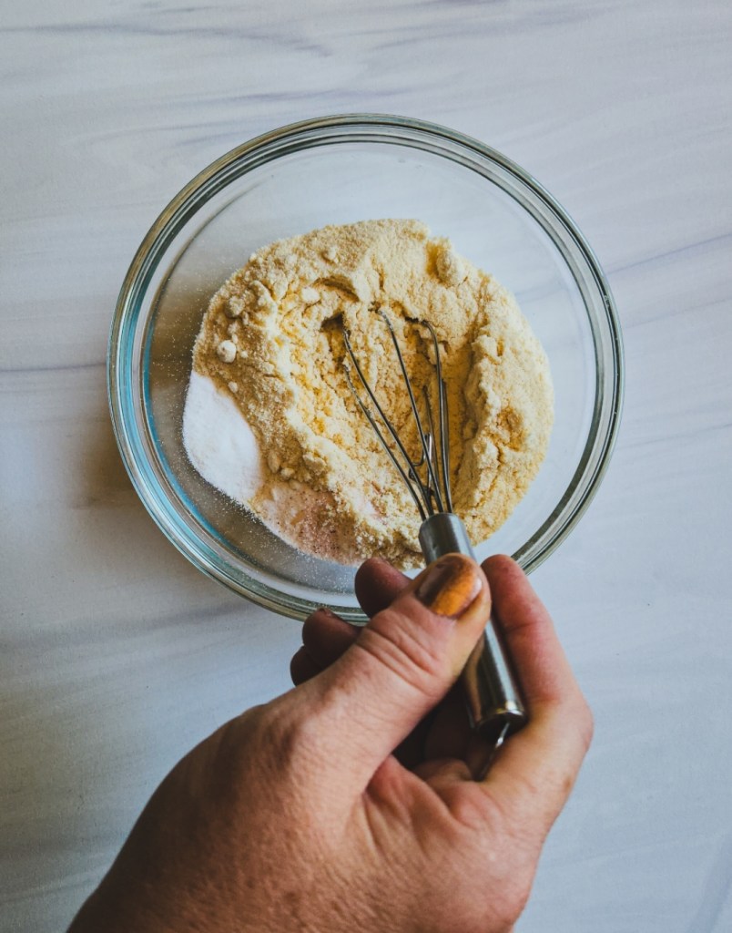 The key is to get them in the oven soon after this reaction occurs so you will get the best keto blueberry muffins! Next, whisk up your dry ingredients in a small bowl.