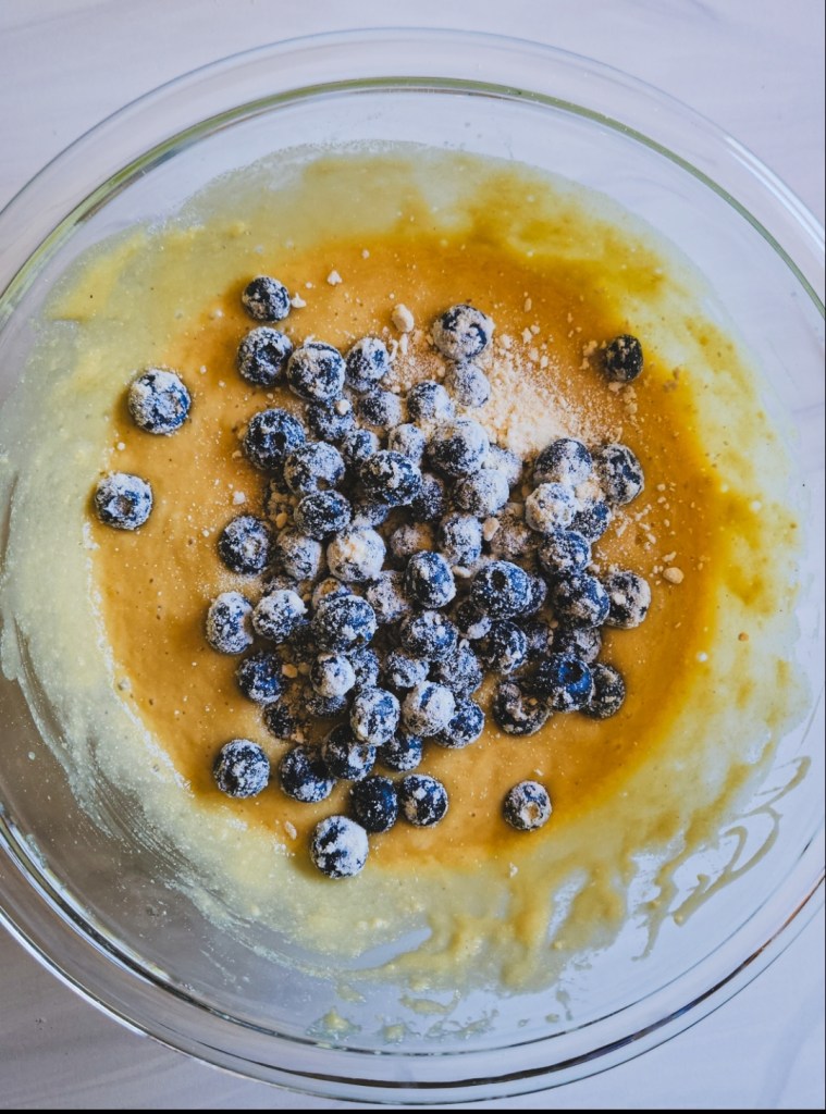 Reserve a 1/4 cup of the remaining blueberries for dotting on top before folding the rest into the batter.