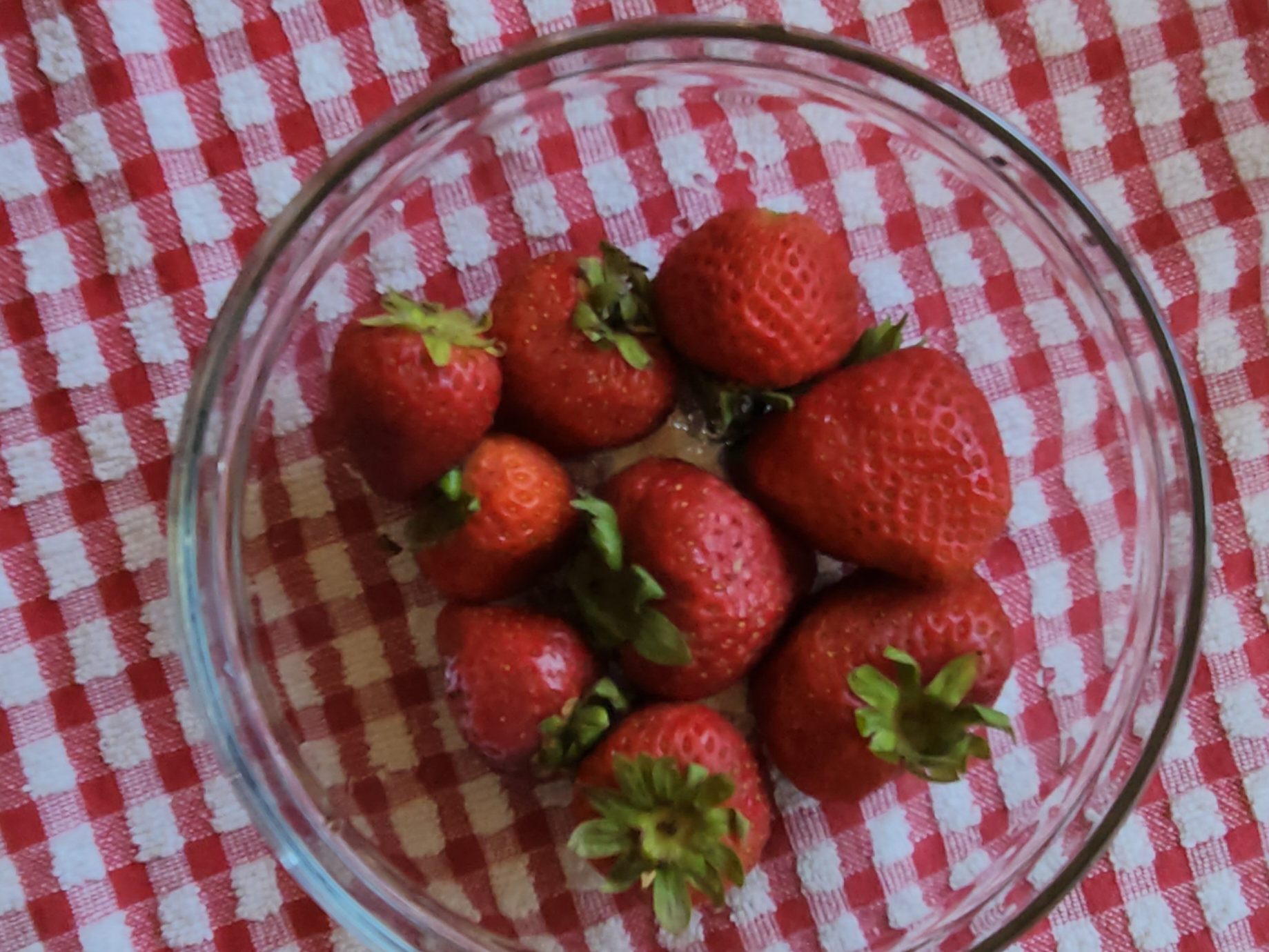• Chop the strawberries into small pieces and put into a small bowl. Sprinkle all of the sweetener over the strawberries and stir to combine.