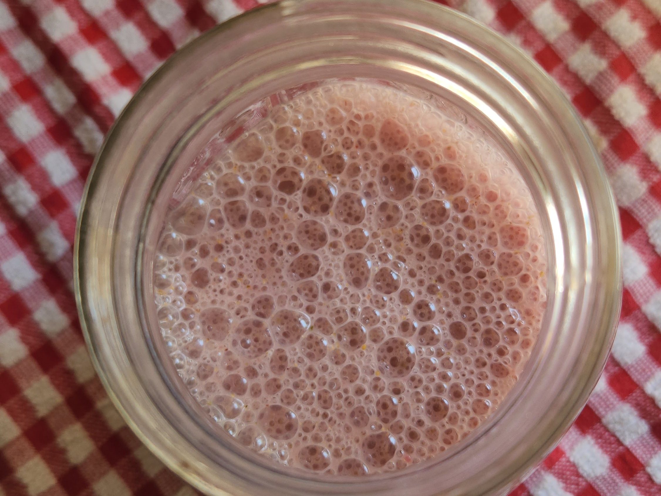 Do not blend much as it will increase in volume, and you do not want that. Now add the strawberry milk to a lidded jar. Put into the fridge while you make the delicious cake.