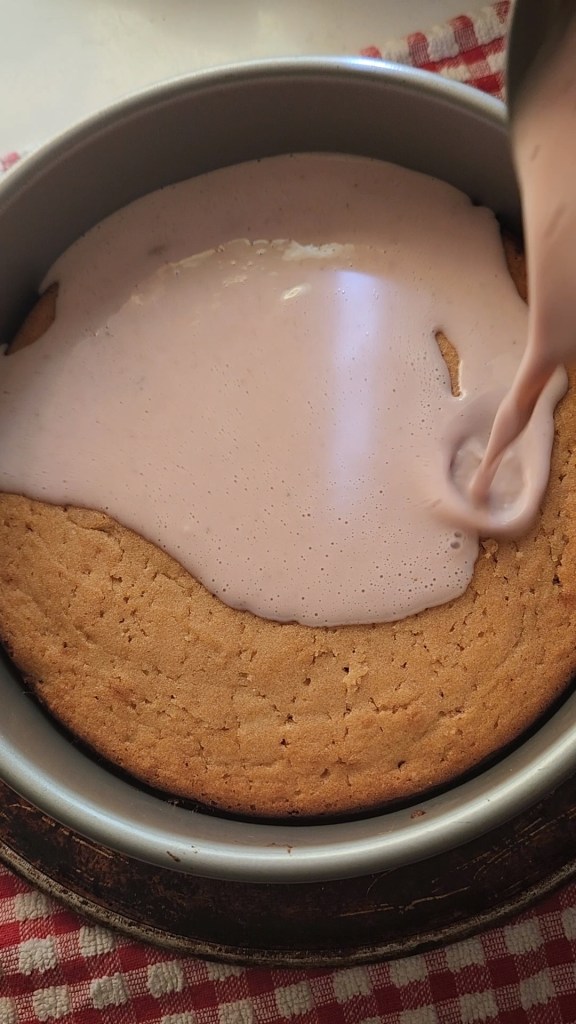 If you did not use a blender, you must strain the strawberry milk before pouring onto the cake. When you pour the strawberry milk onto the cake, it will seem like it is not soaking into the tender cake, but trust me, it will.