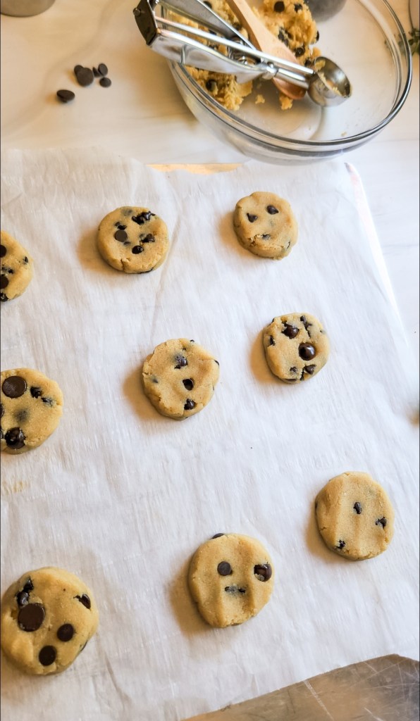 Since they will not spread too much while baking, gently press down to a 1/2″ thickness with the flat bottom of a glass jar or cup.